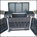 Until recently I have used the aluminium grooming case (pictured bottom left), but in mid 2004 I purchased the newer blue model (top left) with the telescopic handle from Pet Edge (USA) which suits my needs better. Petcetera Etc have one with  telescopic handle now too. The soft grooming totes are also popular. Another good idea is a bicycle basket which can hook onto the side of your show trolley for ready access.